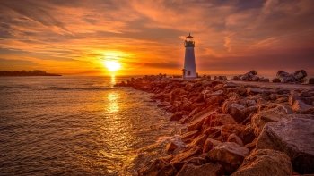 California Sunrise: Lighthouse Over Ocean Horizon HD Wallpaper