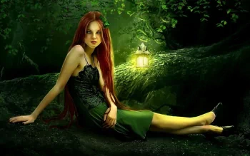 Enchanted Forest Guardian: The Woman in Green with Lantern and Emerald Eyes by Priscila Santos