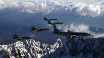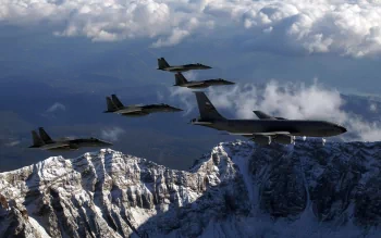 F-15 Eagles Escort KC-135 Stratotanker Over Majestic Mountains – HD Military Wallpaper
