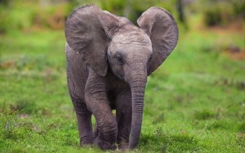 HD desktop wallpaper featuring a young African bush elephant walking on green grass in a natural habitat.