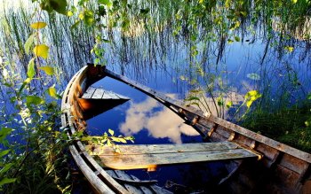 Serene Wreck: Abandoned Boat in Tranquil Waters HD Wallpaper
