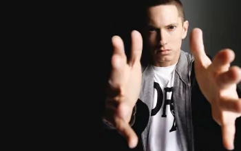 HD PC desktop wallpaper featuring rapper Eminem reaching forward with both hands against a black background, highlighting his intense expression and music persona.