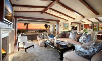 Cozy Sunset Living Room with Fireplace and Ocean View – HD Wallpaper