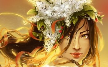 Amazing golden lady with blossoms in her hair.