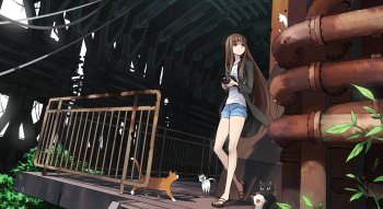 Anime Girl and Cats in Ruins HD Wallpaper by