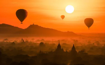 Misty Sunset: Hot-Air Balloons Over Golden Landscape — HD Wallpaper by AtomicZen