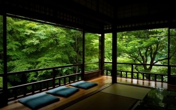 Tranquil Balcony Retreat: HD Wallpaper of Nature-Inspired Interior