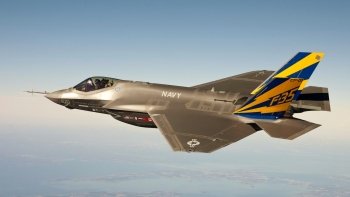 The U.S. Navy variant of the F-35 Joint Strike Fighter, the F-35C, conducts a test flight over the Chesapeake Bay. Lt. Cmdr. Eric "Magic" Buus flew the F-35C for two hours, checking instruments that will measure structural loads on the airframe during flight maneuvers. The F-35C is distinct from the F-35A and F-35B variants with larger wing surfaces and reinforced landing gear for greater control when operating in the demanding carrier take-off and landing environment. (U.S. Navy photo courtesy Lockheed Martin/Released)