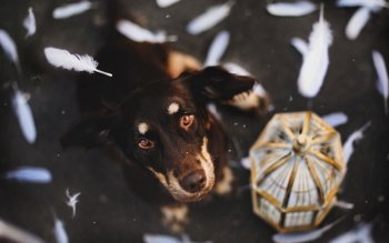 Majestic Australian Shepherd Amidst Falling Feathers – HD Animal Wallpaper by Jessica Trinh