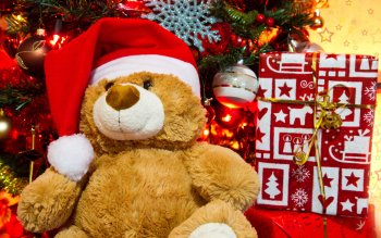 HD Wallpaper: Festive Teddy Bear in Santa Hat Among Christmas Ornaments
