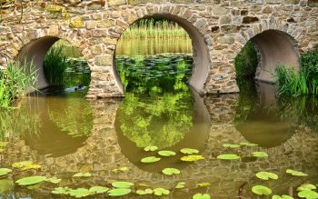 Tranquil Reflections: HD Wallpaper of Arched Bridges Over a Serene Pond