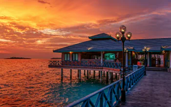 Tropical Maldives Sunset Over Oceanfront Restaurant at Dusk – HD Wallpaper