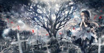 Ethereal Anime Night: Blonde Girl in Haunted Graveyard with Glowing Red Eyes by おにねこ