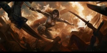 Flaming Katana: Samurai Woman Warrior in Epic Fantasy Battle HD Wallpaper by RedreevGeorge