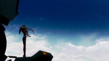 Anime character Zero Two from Darling in the FranXX stands silhouetted against a vibrant sky with clouds. The HD desktop wallpaper captures an ethereal moment.